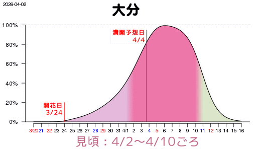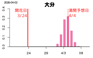 2月中旬以降はかなり暖かくなりました。いまの寒の戻りも一時的で、3月後半も気温の高い状態が続いています。気温は高めですが九州は温暖で休眠打破が弱い影響が大きく、平年並みの開花となりました。